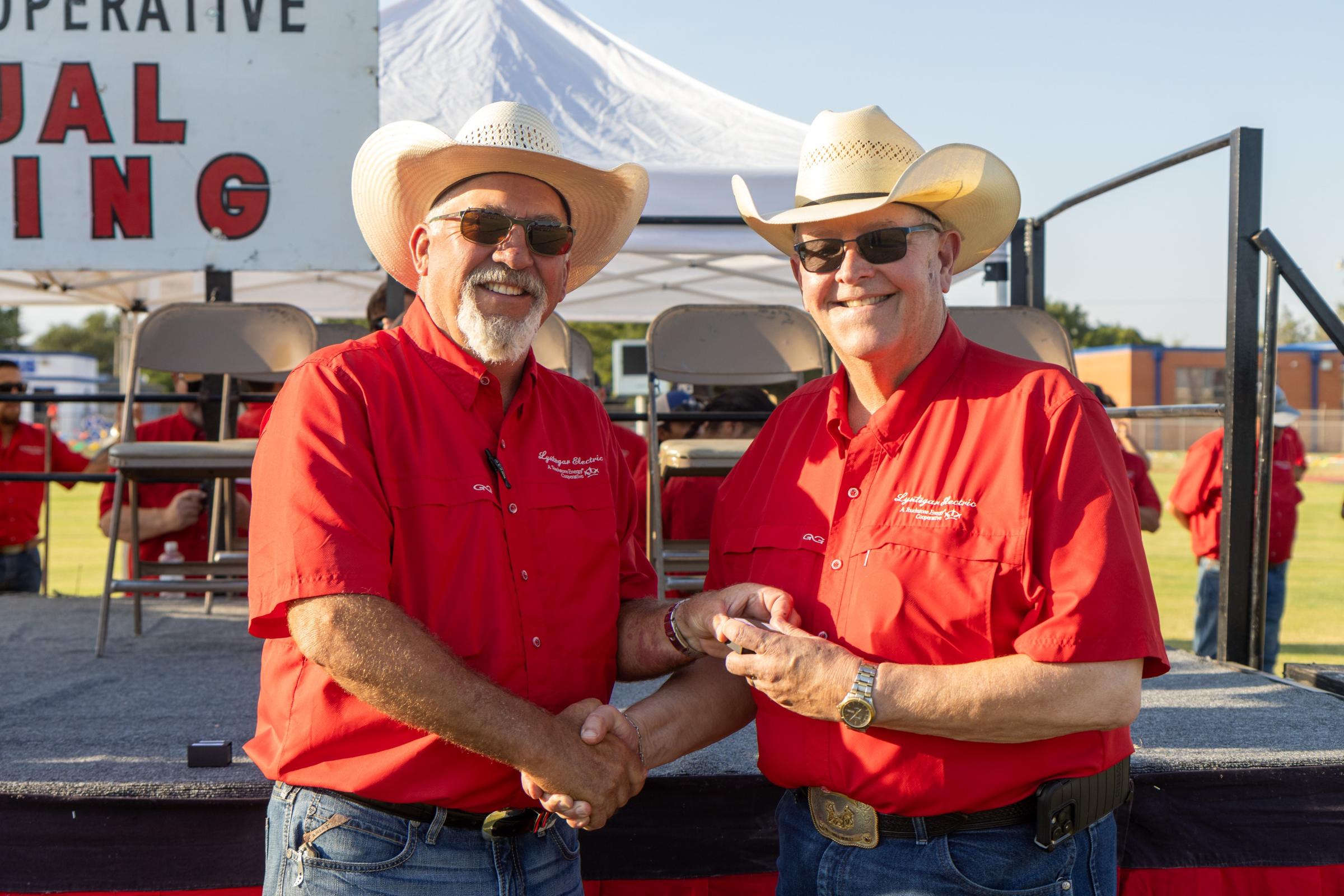 Ben Franklin, left, president of the Lyntegar EC Board of Directors, presents CEO Greg Henley with his 40-year service award at the 87th annual meeting in August.